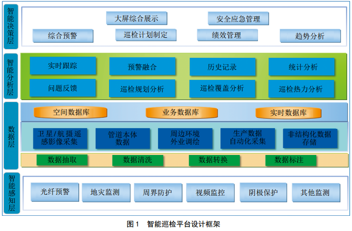 按照“需求導(dǎo)向、頂層設(shè)計、分步實施、創(chuàng)新驅(qū)動”的建設(shè)原則,應(yīng)用移動互聯(lián)網(wǎng)、云計算、大數(shù)據(jù)等信息技術(shù),融合各類安全預(yù)警系統(tǒng)實時報警數(shù)據(jù),建立管道智能巡檢平臺,形成一體化管理。平臺框架包括智能感知層、數(shù)據(jù)平臺層、智能分析層、智能決策層四個部分(圖 1)。