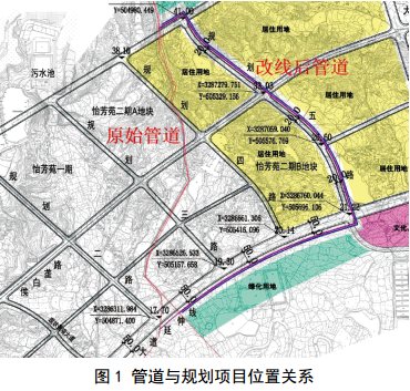 天然氣管道前期建設(shè)時,管道路由基本選擇丘陵及水田,絕大部分按二級地區(qū)設(shè)計,后期由于地方規(guī)劃建設(shè),規(guī)劃用地逐漸靠近、圈占管道,造成管道周邊地區(qū)等級升高,形成新的高后果區(qū)。以典型的Ш級高后果區(qū)JJ-JC-HCAs002為例, 2009年建設(shè)時原管道沿地形敷設(shè)于丘陵地段,按二級地區(qū)設(shè)計,管道壁厚為7.1 mm,管徑為508 mm,設(shè)計壓力為6.3 MPa。2013年,當?shù)貙⒐艿劳窘?jīng)路由段規(guī)劃為芳蘭組團項目,擬建設(shè)大量安置房及配套設(shè)施,管道斜穿規(guī)劃用地,涉及管道長度約2.5 km,如圖 1所示。