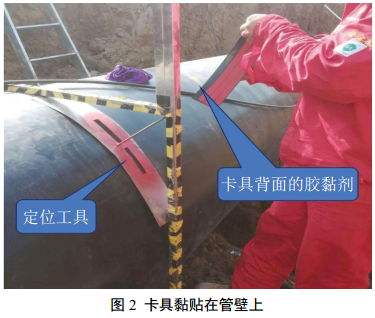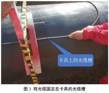 1. 光纜的固定。工程初步設(shè)計(jì)文件將監(jiān)測(cè)光纜用膠帶固定在管壁上。由于鎧裝光纜自重較大,管道防腐層表面光滑,膠帶與防腐層黏結(jié)力不足,難以固定在管壁上。經(jīng)反復(fù)試驗(yàn),在管壁上間隔6 m設(shè)置一個(gè)聚乙烯材料卡具,通過膠黏劑將卡具固定在管壁上,光纜置于卡具槽內(nèi)。