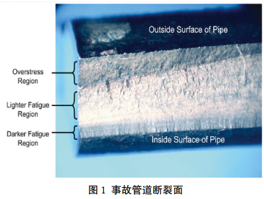 2002年7月4日, Enbridge管道公司( EnbridgePipelines, LLC)運(yùn)營管理的管徑863.6 mm輸油管道在明尼蘇達(dá)州科哈塞特市西部的一處沼澤地發(fā)生破裂,導(dǎo)致954 m3原油泄漏。事故經(jīng)濟(jì)損失約560萬美元,沒有造成人員傷亡。美國運(yùn)輸安全委員會(huì)( NTSB)事故調(diào)查報(bào)告(報(bào)告編號(hào)為PAR0401)記錄了事故管道裂紋情況(圖 1、圖 2)。在靠近斷裂兩端的地方,疲勞裂紋氧化帶延伸至管壁內(nèi)約0.25 mm深,疲勞斷裂的其他部分氧化程度相對(duì)較輕,有152.4 mm的中心疲勞區(qū)域裂紋較深,其中有大約63.5 mm的中心疲勞區(qū)域,疲勞裂紋幾乎穿透管壁(圖 1)。
