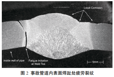 據(jù)資料記載, Enbridge在1974年、 1979年、 1982年、 1986年、 1989年和1991年均發(fā)生了管道縱向焊縫失效事故,管道都由美國鋼鐵公司生產(chǎn)。經(jīng)金相分析認(rèn)定,破裂原因?yàn)楹钢禾幇l(fā)生疲勞裂紋擴(kuò)展導(dǎo)致失效。 Enbridge管徑863.6 mm管道系統(tǒng)還使用了A.O.Smith公司閃焊管道、加拿大Phoenix公司電阻焊管道、 Kaiser Steel公司埋弧焊管道,而所有由疲勞裂紋引起的縱向焊縫失效管道都產(chǎn)自美國鋼鐵公司。