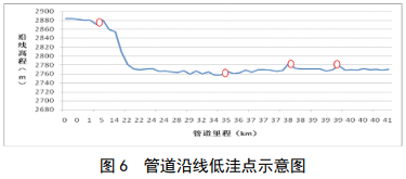 管 道 沿 線 地 形 東 高 西 低 , 地 表 高 程2 752.0~2 883.2 m,相對(duì)高差131.2 m,如圖 6所示。天然氣中的水分因密度較大會(huì)在管道低洼處聚集,容易形成腐蝕敏感區(qū)。