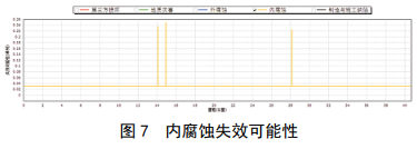 由圖 6可知,管道存在高程低洼點(diǎn): 4.379 km、28.938 km、 37.388 km、 39.224 km等處,水分聚集可能形成腐蝕敏感區(qū)。 2014年11月第二次清管化驗(yàn)結(jié)果顯示天然氣中并未含水, 2016年4月第五次清管雜質(zhì)中含水,應(yīng)該考慮管道低洼點(diǎn)水分聚集形成腐蝕敏感區(qū)。管道內(nèi)腐蝕失效可能性分值為0.0 309~0.2 497,評(píng)價(jià)結(jié)果如圖 7所示,黃色折線代表內(nèi)腐蝕指標(biāo)導(dǎo)致的失效可能性。