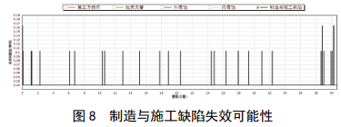 管 道 制 造 與 施 工 缺 陷 指 標(biāo) 分 值 為0.0 206~0.1 651,評(píng)價(jià)結(jié)果如圖 8所示,黑色折線代表制造與施工缺陷導(dǎo)致的失效可能性。