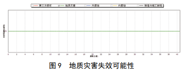 馬仙輸氣管道地處荒漠戈壁,四周地勢(shì)平坦,無(wú)山體、河流、冰川等,常年多風(fēng)少雨,基本無(wú)地質(zhì)災(zāi)害發(fā)生可能。管道全程地質(zhì)災(zāi)害失效可能性分值0.01,評(píng)價(jià)結(jié)果如圖 9所示,綠色折線代表地質(zhì)災(zāi)害導(dǎo)致的失效可能性。