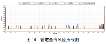 馬仙輸氣管道風(fēng)險(xiǎn)值0.1 666~1.8 857,圖 14反映了管道全線風(fēng)險(xiǎn)值隨里程變化規(guī)律,風(fēng)險(xiǎn)值越大表 示管道風(fēng)險(xiǎn)越大,風(fēng)險(xiǎn)值較高管段見(jiàn)表1。