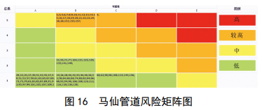 圖 15是馬仙管道整體風(fēng)險(xiǎn)餅狀統(tǒng)計(jì)圖,風(fēng)險(xiǎn)等級(jí)分為高、較高、中、低四個(gè)等級(jí)。評(píng)價(jià)結(jié)果顯示,按管道長(zhǎng)度計(jì)較高風(fēng)險(xiǎn)管段占比0.98%,低風(fēng)險(xiǎn)管段占比99.02%。風(fēng)險(xiǎn)矩陣如圖 16所示。