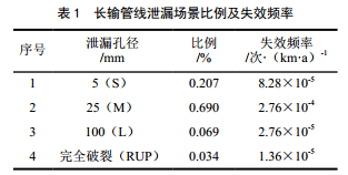 失效頻率的確定普遍采用同類設(shè)備的歷史統(tǒng)計數(shù)據(jù),經(jīng)數(shù)據(jù)來源及可靠性分析后,應(yīng)用相關(guān)理論模型進(jìn)行事故發(fā)生概率計算,然后結(jié)合項目實際情況進(jìn)行修正采用。國外可供查閱的設(shè)備失效數(shù)據(jù)庫較多,而國內(nèi)在這方面的數(shù)據(jù)積累相對較少。天然氣輸送管道的基礎(chǔ)失效頻率來自GB 32167―2015《油氣輸送管道完整性管理規(guī)范》附錄G推薦的輸氣管道泄漏頻率,其頻率為4×10﹣4次/(km·a)。管道的泄漏場景由SY/T 6714―2008《基于風(fēng)險檢驗的基礎(chǔ)方法》和SY/T 6859―2012《油氣輸送管道風(fēng)險評價導(dǎo)則》定義,管道的泄漏場景選取如表 1所示。