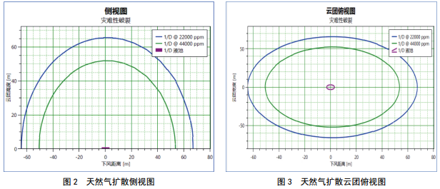 管線輸送介質(zhì)為易燃、易爆的天然氣,發(fā)生火災(zāi)爆炸事故時產(chǎn)生的沖擊波將對人員、財產(chǎn)、建筑物及大氣環(huán)境產(chǎn)生一定影響。利用PHAST軟件,對可能發(fā)生的泄漏和可能產(chǎn)生的事故進(jìn)行定量分析。以管道完全破裂下的天然氣擴(kuò)散、爆炸輻射熱半徑和超壓強(qiáng)度半徑進(jìn)行分析,如圖2-5所示。