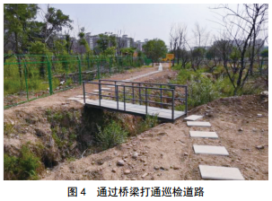 (3)“巡檢系統(tǒng)”透明化。堅(jiān)持按照“無(wú)盲區(qū)”原則設(shè)置高后果區(qū)巡檢關(guān)鍵點(diǎn),對(duì)于有圈隔、圈占的區(qū)域應(yīng)在其內(nèi)部至少設(shè)置一個(gè)關(guān)鍵點(diǎn),對(duì)于有施工活動(dòng)的點(diǎn)位必須設(shè)置一個(gè)關(guān)鍵點(diǎn)。對(duì)于Ⅲ級(jí)高后果區(qū)內(nèi)有影響巡線工通行的障礙、無(wú)法沿管道徒步巡檢的,應(yīng)對(duì)障礙物予以清理或設(shè)置巡檢通道,同時(shí)在管道上方鋪設(shè)50厘米的徒步巡線便道(圖 4)。