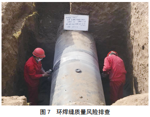 (6)“環(huán)焊縫排查”持續(xù)性。嚴(yán)格按照環(huán)焊縫排查“三步走”戰(zhàn)略,第一步完成重點(diǎn)管段、焊口排查和處置。第二步完成剩余一般管段、焊口排查和處置。第三步完成抽樣復(fù)查焊口和底片的一致性比對(duì)。結(jié)合前期開(kāi)挖驗(yàn)證結(jié)果,補(bǔ)充開(kāi)挖部分焊口并驗(yàn)證焊口與底片的一致性(合計(jì)抽樣比例達(dá)到 1%)。如發(fā)現(xiàn)不一致,加倍抽檢;若加倍后仍發(fā)現(xiàn)不一致,則全部開(kāi)挖復(fù)拍(圖 7)。