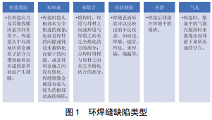 環(huán)焊縫缺陷主要有:焊接裂紋、未焊透、未熔合、夾渣、氣孔及形狀缺陷等(圖 1)。