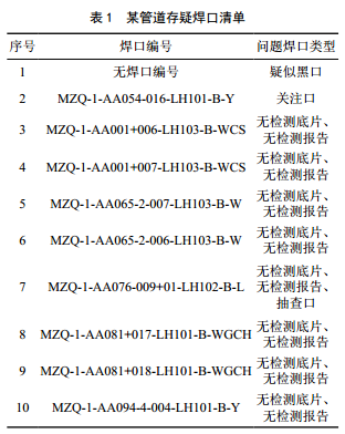 通過收集各在役管道工程竣工資料和內(nèi)檢測資料,復(fù)查竣工資料和施工記錄、監(jiān)理記錄、無損檢測報(bào)告符合性和一致性,完成內(nèi)檢測環(huán)焊縫數(shù)據(jù)和施工記錄對齊。識(shí)別疑似“黑口”,對內(nèi)檢測公司提供的管道漏磁內(nèi)檢測信號(hào)數(shù)據(jù)進(jìn)行復(fù)核,識(shí)別“嚴(yán)重”“較嚴(yán)重” “輕微”異常焊口,并開列“嚴(yán)重”異常焊口底片復(fù)核影像資料,聘請專家復(fù)核無損檢測底片,提出存疑焊口,形成存疑焊口清單(表 1)。