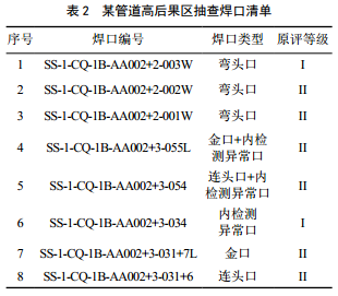 通過竣工資料,收集高后果區(qū)內(nèi)焊口清單和施工記錄,鑒于環(huán)焊縫失效事故發(fā)生在連頭口、金口、 變壁厚焊口、返修焊口上的比例很高,因此按此順序優(yōu)先抽查高后果區(qū)內(nèi)的上述焊口,形成抽查焊口清單(表 2)。