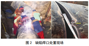 隨后立即按照應(yīng)急處置預(yù)案啟動(dòng)應(yīng)急程序,放空該段管道,疏散潛在影響半徑范圍內(nèi)的人員,對缺陷處焊口進(jìn)行切割換管作業(yè)(圖 2)。焊縫搶險(xiǎn)作業(yè)從發(fā)現(xiàn)問題到搶修完成共計(jì)50小時(shí)45分鐘;切割舊管到新管段焊接完成共計(jì)23小時(shí)09分鐘。通過處置,及時(shí)消除了本段高后果區(qū)管道重大隱患。