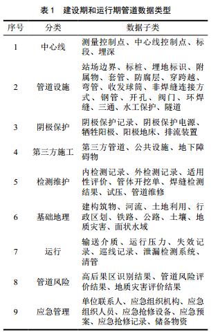 管道高后果區(qū)兼具管道和高后果區(qū)的屬性,其中涉及管道的數(shù)據(jù)參數(shù)包括管材、管徑、壁厚、管道中心線、安裝施工、無損檢測、內(nèi)/外檢測、陰極保 護(hù)、三樁、第三方設(shè)施、管道修復(fù)、地質(zhì)災(zāi)害等,涉及高后果區(qū)的數(shù)據(jù)參數(shù)包括建構(gòu)筑物、河流、公路、鐵路、易燃易爆場所等。因管道多敷設(shè)于地下,根據(jù)數(shù)據(jù)來源的不同,可將上述數(shù)據(jù)分為地上數(shù)據(jù)和地下數(shù)據(jù)兩類。