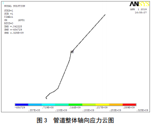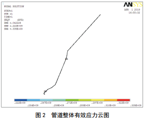 以 高 陡 邊 坡 滑 坡 區(qū) 域 內(nèi) 管 道 為 對 象 , 利 用ANSYS軟件建立該滑坡段管道應(yīng)力分析模型,根據(jù)現(xiàn)場勘察數(shù)據(jù)對模型施加邊界條件,計(jì)算外部荷載作用下管道與焊縫的應(yīng)力值。經(jīng)計(jì)算,管道最大有效應(yīng)力為335 MPa(圖 2),最大軸向應(yīng)力為325 MPa(圖 3),應(yīng)力水平滿足規(guī)范要求;提取受滑坡影響區(qū)域內(nèi)環(huán)焊縫的應(yīng)力值,結(jié)果顯示滿足規(guī)范要求。