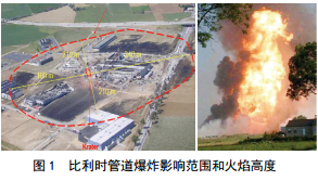 2004年7月30日上午9時,位于比利時首都布魯塞爾以南40 km處工業(yè)區(qū)的高壓輸氣管道發(fā)生爆炸。事故管道管徑1 000 mm、材質(zhì)X70、壁厚10 mm,日常輸送壓力8 MPa,發(fā)生事故時的管道壓力為7.3 MPa。爆炸后火焰最高達450 m,平均高度250 m。事故造成24人死亡(包括5名消防人員和1名警察), 132人受傷(其中重傷25人),多輛車輛被毀,摧毀了兩家工廠,方圓1 000 m范圍內(nèi)的生態(tài)環(huán)境受到不同程度的影響(圖 1)。