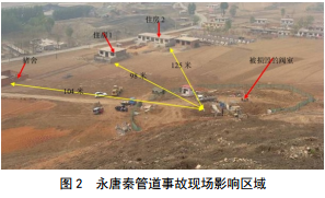 2010年5月4日,永唐秦管道位于秦皇島撫寧縣榆關(guān)鎮(zhèn)龍口店村的15#閥室發(fā)生爆炸起火事故,未造成人員傷亡,現(xiàn)場98米的室內(nèi)可燃物充分燃燒, 104米外豬舍的豬被烤熟。該管道管徑1 016 mm,運行壓力5 MPa。發(fā)生泄漏的管道為閥室內(nèi)壓縮機預(yù)留管線,管徑為355.6 mm,與主管道相連。事故的直接原因為 雷擊。管線在72小時內(nèi)經(jīng)搶險恢復(fù)運行(圖 2)。