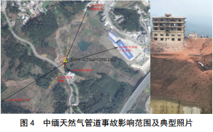 2017年7月2日,中緬天然氣管道在貴州晴隆縣境內(nèi)因當?shù)爻掷m(xù)降雨引發(fā)公路邊坡下陷側(cè)滑,擠斷沿邊坡埋地敷設(shè)的輸氣管道,導(dǎo)致天然氣泄漏引發(fā)燃燒爆炸(圖 4), 230米外的農(nóng)貿(mào)市場受損, 40米外的樓房燒毀, 350米外的樹葉干枯。該管道管徑1 016 mm,運行壓力6.74 MPa。事故造成1人死亡、 23人受傷,直接經(jīng)濟損失2 145萬元。