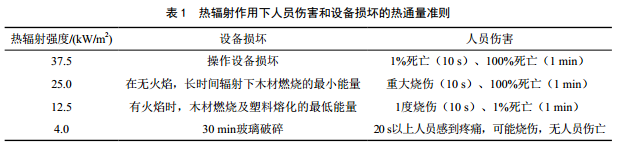 天然氣管道發(fā)生泄漏起火,形成噴射火,火災(zāi)熱輻射影響主要是取決于是否有人員暴露于火焰或特定的熱輻射中,表 1為熱輻射作用下人員傷害和設(shè)備破壞的熱通量準則。