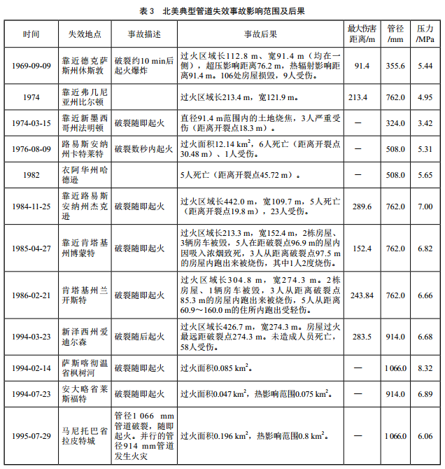 表 3列舉了美國和加拿大典型輸氣管道失效事故影響范圍及后果。