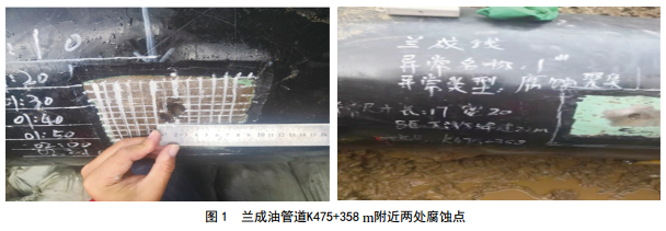 依據(jù)蘭成原油管道漏磁檢測(cè)結(jié)果及現(xiàn)場(chǎng)環(huán)境分析,選取干濕交替管段作為開(kāi)挖驗(yàn)證的重點(diǎn)管段,開(kāi)挖驗(yàn)證結(jié)果如圖 1所示。顯示蘭成原油管道K475+358 m附近存在兩處金屬腐蝕點(diǎn),腐蝕深度均達(dá)到30%以上。