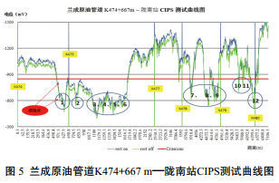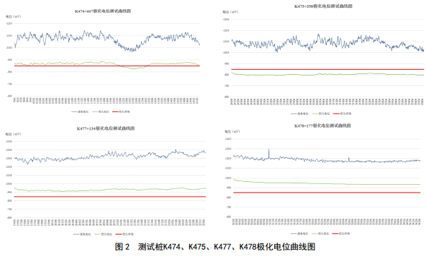在蘭成原油管道腐蝕點(diǎn)附近四處測(cè)試樁埋設(shè)試 片,測(cè)試其極化電位,結(jié)果如圖 2所示。數(shù)據(jù)表明,除K475測(cè)試樁極化電位未達(dá)到﹣850 mV(cse)要求外,其余測(cè)試樁極化電位數(shù)據(jù)均正常,上下游恒電位儀機(jī)柜輸出電流合適,排除了管道整體陰保不足的可能。