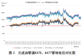 圖 3表明,管道檢測(cè)期間確實(shí)受到外界雜散電流的干擾,但是兩處的波動(dòng)趨勢(shì)相近、幅度相同,這表明K475電位比K477明顯偏正的原因并不是外界雜散電流干擾造成的,排除了直流雜散電流對(duì)管道管地電位造成較大影響的預(yù)判。