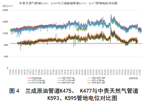 再將測(cè)試樁K477、 K475與鄰近的中貴天然氣管道測(cè)試樁K593、 K595管地電位對(duì)比,兩并行管道電位波動(dòng)趨勢(shì)相同,從而判斷兩條管道不存在相互干擾的情況,對(duì)比結(jié)果如圖 4所示。