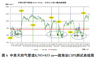 該管段敷設(shè)環(huán)境從山體變?yōu)樾『訙,其中大部分管段與小河并行,并多處交叉。在排除了交直流雜散 電流干擾、兩管互相干擾和管道整體陰保不足的可能后,對(duì)該管段進(jìn)行了密間隔電位測(cè)試。蘭成原油管道K474+667 m—隴南站CIPS測(cè)試曲線及中貴天然氣管道K593+855 m—隴南站CIPS測(cè)試曲線如圖 5、圖 6所示。兩條管道管地電位偏正管段的相同,在空間上存在一致的波動(dòng)趨勢(shì)。管地電位均在圖中標(biāo)注的1—12號(hào)點(diǎn)位開(kāi)始正向偏移。正向偏移位置為陽(yáng)極區(qū)與現(xiàn)場(chǎng)腐蝕發(fā)生位置吻合。驗(yàn)證了干濕交替敷設(shè)環(huán)境對(duì)該管段造成欠保護(hù)影響。