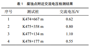 檢測(cè)前述測(cè)試樁附近管道的交流雜散電流,結(jié)果如表 1所示。