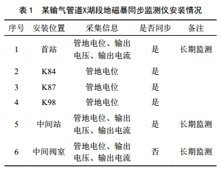為了監(jiān)測(cè)X湖段管地電位的變化,在某輸氣管道首站、中間站等位置安裝了地磁暴同步監(jiān)測(cè)儀,可以同步監(jiān)測(cè)管地電位、管中電流、恒電位儀輸出電壓(電流)等參數(shù),采用GPRS網(wǎng)絡(luò)傳輸數(shù)據(jù)。該設(shè)備安裝在陰極保護(hù)間恒電位儀后面,不干擾陰極保護(hù)間其他通訊,安裝方便快捷,免維護(hù),如圖 1所示。