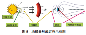 眾所周知,太陽活動(dòng)會(huì)形成太陽風(fēng),當(dāng)太陽風(fēng)攜帶大量等離子體到達(dá)地球磁層,地球磁層與電離層的相互作用會(huì)引起地磁場(chǎng)的劇烈擾動(dòng),一系列空間天氣的變化從而引發(fā)劇烈的地磁擾動(dòng)——地磁暴,如圖 5所示。