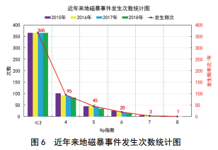地磁擾動(dòng)的強(qiáng)度與太陽風(fēng)的等離子體強(qiáng)度密切相關(guān),對(duì)于管道來說另一個(gè)重要的影響因素就是土壤電阻率的變化程度。其波形圖其實(shí)是無固定周期的,它沒有明顯的變化規(guī)律,持續(xù)時(shí)間為數(shù)小時(shí) 到數(shù)天。但是地磁暴發(fā)生時(shí),其頻率變化大多落入0.01~0.0 001 Hz的頻率范圍內(nèi)。 2016年9月1日至2018年11月24日期間,根據(jù)中科院國(guó)家空間環(huán)境預(yù)報(bào)中心的數(shù)據(jù)來看,共發(fā)生了1次超大磁暴, 3次大磁暴, 24次中磁暴, 61次小磁暴。隨著太陽活動(dòng)進(jìn)入新的活躍周期,近三年地磁暴發(fā)生的頻率和等級(jí)都維持在一個(gè)比較高的水平,如圖 6所示。