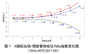 X湖段站場(chǎng)/閥室管地電位與Kp指數(shù)變化如圖 7所示,當(dāng)中間站管地電位偏負(fù)屬于電流流入?yún)^(qū)時(shí),中間閥室和首站管地電位正偏并且屬于電流流出區(qū)。當(dāng)Kp指數(shù)增大時(shí),管地電位的波動(dòng)幅度也增大,現(xiàn)場(chǎng)監(jiān)測(cè)到中間站最負(fù)電位﹣3.94 V, 3#閥室最正電位﹢1.33 V,首站最正電位﹢2.38 V。