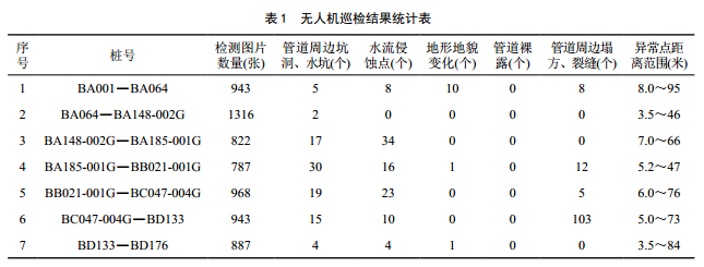 鄂爾多斯作業(yè)區(qū)管轄陜京四線管道逾370公里,穿越庫布其、毛烏素沙漠段180余公里,途經(jīng)丘陵、溝壑105公里,穿越大型河流、鐵路、公路62處,管道沿線水工640余處,具有沿線地貌差異大、線路長、巡線難度大等特點(diǎn)。以智能巡檢系統(tǒng)管理平臺(tái)、采用縱橫TX-20和TX-10垂直起降固定翼無人機(jī)對(duì)該段管道進(jìn)行巡檢,累計(jì)飛行時(shí)間8.3小時(shí),總覆蓋面積97平方公里,處理航拍圖片6 666 張。通過圖像識(shí)別發(fā)現(xiàn)多處隱患,結(jié)果統(tǒng)計(jì)如表 1所示。