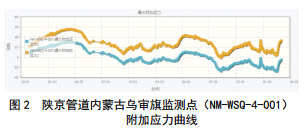 目前陜京管道共安裝監(jiān)測(cè)點(diǎn)100多處,覆蓋陜京一線、二線、三線、四線和大唐煤制氣管線、永唐秦管線等(圖 1)。陜京四線內(nèi)蒙古輸氣管理處已安裝16處,系統(tǒng)運(yùn)行良好。由圖 2烏審旗監(jiān)測(cè)點(diǎn)28個(gè)月監(jiān)測(cè)數(shù)據(jù)可知,管道所受最大附加應(yīng)力均在60 MPa以下,遠(yuǎn)不及三級(jí)應(yīng)力報(bào)警閾值126 MPa。該監(jiān)測(cè)點(diǎn)監(jiān)測(cè)期間無地質(zhì)災(zāi)害發(fā)生。