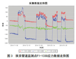 2014年11月底至2015年2月初,陜京管道某壓氣站下游的兩個(gè)監(jiān)測(cè)點(diǎn)S1a-1330和S1a-1333-7應(yīng)力數(shù)據(jù)變化較大,局部數(shù)據(jù)達(dá)到了三級(jí)報(bào)警閾值,從圖 3可 以明顯看出數(shù)據(jù)成間歇波峰狀,表明管道在特定時(shí)間段受到較大附加應(yīng)力。
