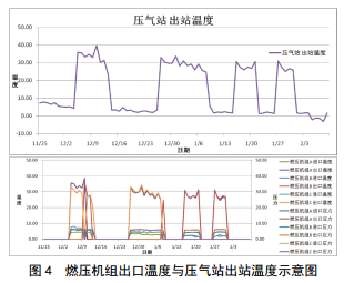 通過對(duì)壓氣站的日常運(yùn)行數(shù)據(jù)進(jìn)行分析,發(fā)現(xiàn)應(yīng)力變化與壓縮機(jī)組啟機(jī)時(shí)間段重合,壓氣站的出站溫度與燃?jí)簷C(jī)組的出口溫度呈正相關(guān)(圖 4),表明溫度是導(dǎo)致管道附加應(yīng)力上升的主要因素。本次預(yù)警直觀、真實(shí)反映了管道的應(yīng)力狀態(tài)。
