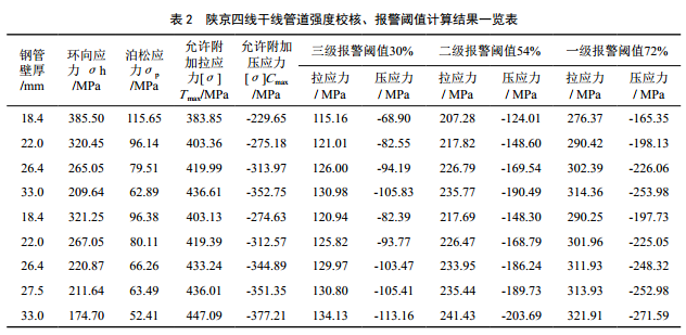 參考中石油企業(yè)標(biāo)準(zhǔn),三級(jí)預(yù)警閾值設(shè)置原則如下:管體附加應(yīng)力超過允許附加應(yīng)力 [σ ]Tmax或[σ ]Cmax 的30%,發(fā)布三級(jí)預(yù)警;超過 [σ ]Tmax或[σ ]Cmax的60%,發(fā)布二級(jí)預(yù)警;超過 [σ ]Tmax或[σ ]Cmax的90%,發(fā)布一級(jí)預(yù)警。
