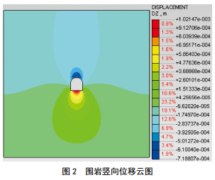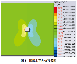 模擬的圍巖豎向及水平向位移云圖分別如圖 2和圖 3所示?梢钥闯,隧道拱頂位置沉降量最大,為0.72 mm,隧底出現(xiàn)較大底鼓現(xiàn)象,最大底鼓量為 1.02 mm,水平位移(凈空方向)最大值出現(xiàn)在隧道左右側(cè)邊墻中部,均約為0.39 mm?傮w來(lái)看,隧道位移較小。