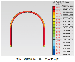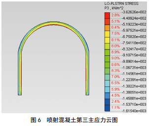 模擬的噴射混凝土第一主應(yīng)力和第三主應(yīng)力分布分別如圖 5和圖 6所示?梢钥闯,整個(gè)隧道斷面噴射混凝土第一主應(yīng)力極值為2.6×10-3 MPa,滿足C30噴射混凝土抗拉設(shè)計(jì)強(qiáng)度1.5 MPa的要求;拱腳部位外側(cè)噴射混凝土第三主應(yīng)力較大,最大值為-1.6 MPa,滿足C30噴射混凝土抗壓設(shè)計(jì)強(qiáng)度15 MPa的要求。
