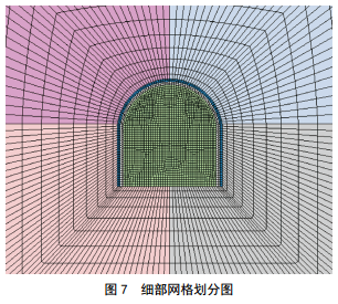 Ⅴ 級(jí) 圍 巖 一 般 段 開(kāi) 挖 跨 度 4.5 m , 開(kāi) 挖 高 度4.6 m,模型計(jì)算范圍為:水平方向左、右兩邊和隧道上、下方向取洞高的5倍。模型共劃分總單元數(shù)6 457個(gè),節(jié)點(diǎn)總數(shù)為6 074個(gè),計(jì)算模型總體網(wǎng)格和細(xì)部網(wǎng)格劃分如圖 7所示。釋放荷載分擔(dān)比例為:開(kāi)挖階段釋放45%,施作第一層噴錨支護(hù)階段釋放30%荷載,第二層噴射混凝土施作階段釋放25%。隧道圍巖及支護(hù)結(jié)構(gòu)力學(xué)參數(shù)取值見(jiàn)表 2。