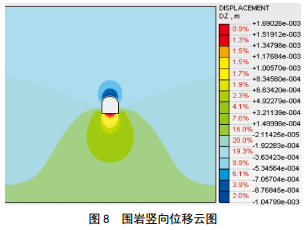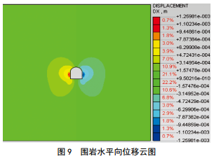模擬的圍巖豎向及水平向位移云圖分別如圖 8 和圖 9所示?梢钥闯,隧道拱頂位置沉降量最大,為1.05 mm,隧底出現(xiàn)較大底鼓現(xiàn)象,最大底鼓量為1.69 mm,水平位移(凈空方向)最大值出現(xiàn)在隧道左右側(cè)邊墻中部,均約為1.26 mm?傮w來(lái)看,隧道位移較小。
