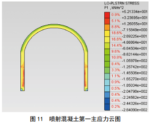 模擬的噴射混凝土第一主應(yīng)力和第三主應(yīng)力分布分別如圖 11和圖 12所示?梢钥闯,整個(gè)隧道斷面邊墻內(nèi)側(cè)噴射混凝土第一主應(yīng)力較大,最大值為 0.05 MPa,滿足C30噴射混凝土抗拉設(shè)計(jì)強(qiáng)度1.5 MPa的要求;邊墻部位外側(cè)噴射混凝土第三主應(yīng)力較大,最大值為﹣2.96 MPa,滿足C30噴射混凝土抗壓設(shè)計(jì)強(qiáng)度15 MPa的要求。