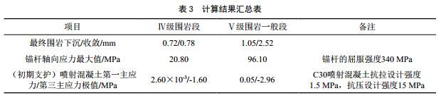 (1)采用地層結(jié)構(gòu)法分別對(duì)Ⅳ級(jí)圍巖及Ⅴ級(jí)圍巖一般段支護(hù)結(jié)構(gòu)進(jìn)行計(jì)算,圍巖最終位移及支護(hù)結(jié)構(gòu)應(yīng)力極值計(jì)算結(jié)果見(jiàn)表 3(表中應(yīng)力“+”為受拉,“-”為受壓),結(jié)果顯示各計(jì)算模型圍巖位移及支護(hù)結(jié)構(gòu)受力均較小,在規(guī)范規(guī)定各級(jí)圍巖允許位移及結(jié)構(gòu)安全范圍內(nèi),支護(hù)結(jié)構(gòu)具有一定的安全儲(chǔ)備,表明設(shè)計(jì)采用的隧道支護(hù)參數(shù)及施工方案能夠滿足工程要求。