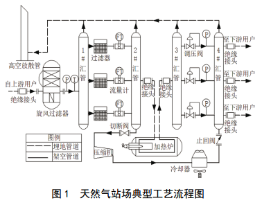天然氣站場包含過濾區(qū)、調(diào)壓區(qū)、計(jì)量區(qū)、加熱爐區(qū)、加壓區(qū)、排污區(qū)等單元。過濾區(qū)主要是對(duì)進(jìn)入站場的天然氣進(jìn)行初步雜質(zhì)過濾,經(jīng)過調(diào)壓區(qū)降低管道內(nèi)天然氣壓力和溫度,空氣中的水分冷凝于管道外,易形成腐蝕環(huán)境。加熱爐區(qū)通過水浴式加熱爐提高天然氣的溫度,有效解決調(diào)壓區(qū)“冒汗”問題[2]。天然氣站場典型工藝流程如圖 1所示。