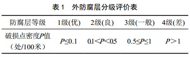 站場管道長度短、支管多、管道接地點(diǎn)密集,施加的電流信號(hào)通過接地體流入整個(gè)管道和接地系統(tǒng),導(dǎo)致管道在某些位置出現(xiàn)電流疊加,因此不能按照電流衰減來計(jì)算防腐層整體質(zhì)量,對(duì)于采用三層聚乙烯復(fù)合結(jié)構(gòu)防腐層的埋地管道,可以根據(jù)表 1對(duì)埋地管道外防腐層進(jìn)行分級(jí)評(píng)價(jià)[4]。