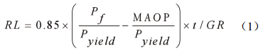 式中RL 腐蝕壽命, a年; C 年校正系數(shù); P f計(jì)算失效壓力, MPa; MAOP最大允許工作壓力, MPa;Pyield屈服壓力, MPa; GR腐蝕速率, mm/a); t名義壁厚, mm。